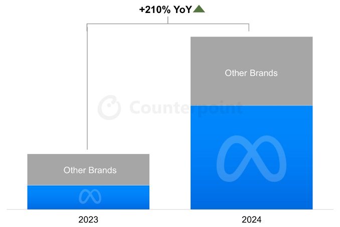 2 月 28 日消息,市場調查機構 CounterPoint Research 昨日(2 月 26 日)發布博文,報告稱歸功于 Meta x 雷朋眼鏡,全球智能眼鏡市場蓬勃發展,出貨量在 2023 年同比增長 156% 的基礎上,2024 年再次實現同比增長 210%。