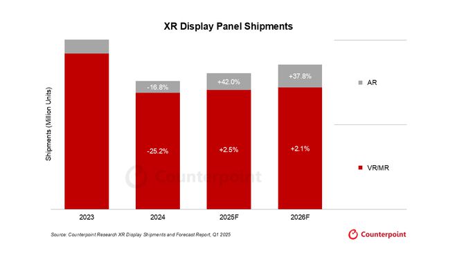 市場調查機構 Counterpoint Research 于 5 月 3 日發布博文,預估 2025 年全球 XR 頭顯屏幕出貨量同比增長 6%,其中 AR 眼鏡出貨量將大幅增長 42%,遠超 VR 設備(2.5%),成為增長最快的細分領域。