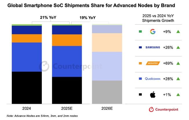 市場調查機構CounterPointResearch昨日(11月5日)發布博文,預測2025年全球智能手機應用處理器(AP-SoC)市場將迎來關鍵拐點,采用5nm及更先進制程工藝(包含5nm/4nm/3nm/2nm)的手機SoC出貨量占比將達到51%,首次超過總出貨量的一半。
