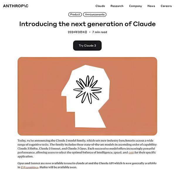 Anthropic 發布的 Claude3系列模型超越了 GPT-4,在多模態和語言能力上表現出色。Claude3系列模型包括 Opus、Sonnet 和 Haiku,能力依次從低到高,可以根據需求選擇合適的模型。