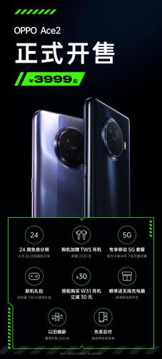 4月20日10點,OPPO Ace2正式在線上線下全渠道開售。在首銷當天,OPPO Ace2更壕無人性大撒禮包:在預售期間支付100元定金的用戶,支付尾款即可享受加贈半年延保的權益,預售或首銷當日購機便能享24期免息,更有全渠道前2000名預定用戶支付尾款可獲得TWS無線耳機等貼心大禮。