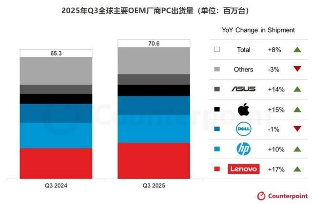 根據CounterpointResearch的數據顯示,2025年Q3全球PC出貨量同比增長1%。這一增長主要得益于微軟將于2025年10月結束對Windows10的支持,以及與美國進口關稅變化相關的庫存策略調整。