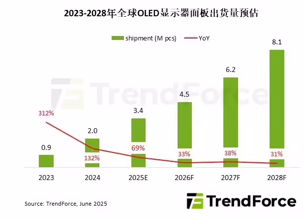 根據 TrendForce 集邦咨詢最新調查,盡管總體經濟情勢面臨壓力,但 OLED 顯示器面板買賣雙方皆態度積極,繼 2024 年迎來爆發性的 132% 年成長后,預計這股出貨動能將延續至 2025 年,該機構因此上修今年OLED顯示器面板出貨量,由 280 萬片調整至 340 萬片,年增從 40% 上升至 69%。