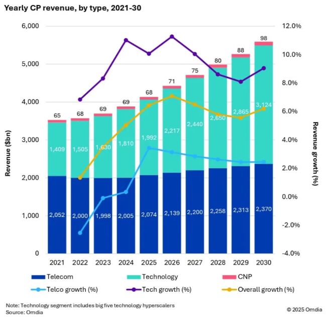 市場研究公司Omdia最新發布的《全球通信提供商收入與資本支出預測》報告顯示,在技術創新、基礎設施擴張及6G與人工智能(AI)戰略投資的推動下,到2030年,全球通信提供商(CommunicationsProviders,CP)收入預計將達到6萬億美元,2025年至2030年期間的復合年增長率將達2%。