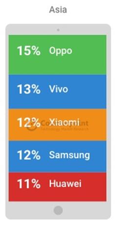 然而,回顧過去一年,OPPO的市場表現依然令人矚目。目前,第四季度數據尚未出爐,但市場數據調研公司Strategy Analytics報告顯示,2017第一季度和第二季度OPPO都保持了迅猛的增長勢頭,成為增速最高的手機品牌。而到了第三季度,OPPO已經成為亞洲地區手機出貨量的第一名。