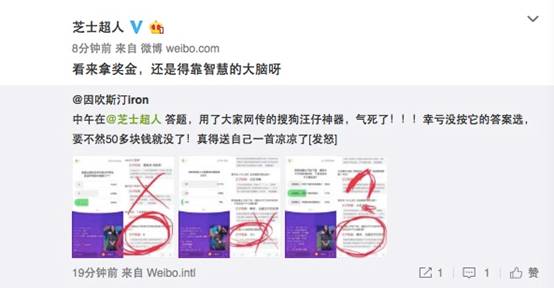 據說1月16日中午12:30場答題,《芝士超人》針對“答題神器”推出新玩法,在題目設置上開展了人腦與機器搜索的PK,采用“迷魂法”打亂機器搜索。例如第一道題“國道公路標志中的英文字母在英語字母中排第幾個?”就迷惑了機器搜索,成功躲過“外掛”。