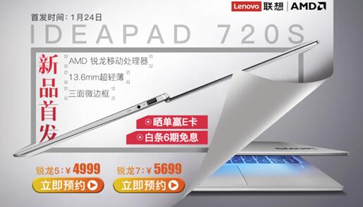 首款搭載AMD銳龍移動處理器的超輕薄筆記本電腦已經到來,聯想IdeaPad 720S 用強大直觀的計算性能、13.6mm的超輕薄設計、走心思考的細節和超高性價比的優惠,讓每一名用戶感受專業品質的力量。良心預售專享價低至4999元,1月24日強勢首發,更多優惠切莫錯過!詳情請點擊京東預售專場https://sale.jd.com/act/C6ARm5MJEly.html