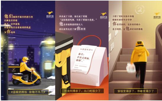 透過美團外賣“溫暖團圓飯,致敬不平凡”H5不難發現,融合手繪風格的畫面樸實動人地展現了美團騎手們從取餐到配送,從街頭到樓道,每一張訂單背后奔波不停的真實場景。“他是你最熟悉你的陌生人,卻比前男友更了解你的胃”、“你看得到的,是距離的縮小;看不到的,是他和時間的賽跑”、“他為你跑過數百家餐廳,卻不曾安靜坐下來享用過一餐熱飯”……精準扎心的文案將騎手樸素的內心獨白、人與人之間的相遇描繪得溫情而感動,并產生深深的情感共鳴。除了客戶端H5推送,美團外賣還聯合各大商家專為騎手推出“過年了,我們請你吃頓團圓飯”主題活動,邀請各地騎手小哥在寒冬臘月吃上一頓暖心餐。