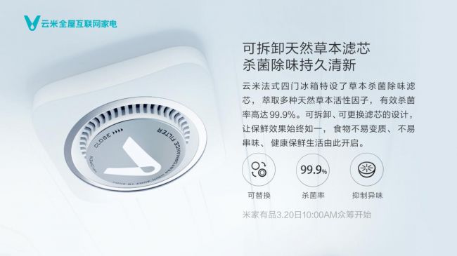 而云米智能法式四門冰箱特別采用了環抱楚風設計,能夠保證食物的冷卻速度和效果,同時兩側出風也能避免十五被風干,保證食品的新鮮。草本殺菌濾芯,可保證99.9%的殺菌率,同時解決了冰箱容易產生異味的問題。