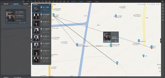為了獲取人員空間信息,獵鷹新增智能地圖模塊。人員排查時,可在地圖上通過豐富的調度方式快速進行視頻調閱;人員軌跡重建時,智能地圖可以時間為軸進行人員軌跡的刻畫;此外,智能地圖還支持進行人、車、MAC的軌跡碰撞。