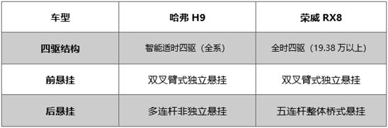 在越野能力方面,兩款車都采用硬派越野車當中常見的非承載式車身結構。懸掛系統方面,哈弗H9采用了多連桿非獨立后懸掛,而榮威RX8則采用了五連桿整體橋式懸掛。理論上來說整體橋式懸掛會有著更好的越野性能,但在實際試駕體驗之后會發現榮威RX8的底盤并沒有發揮出應有的賬面水準。