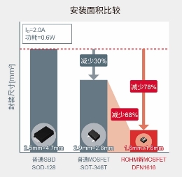 例如電流2.0A、功耗0.6W時,在車載市場被廣為使用的帶引腳封裝MOSFET,與SBD相比,可削減30%的安裝面積。而底部電極封裝的MOSFET,由于是底部電極,散熱性更好,不僅可實現小型化,還可實現大電流化。因此,與傳統的SBD相比,其安裝面積可削減78%,與普通的MOSFET相比,其安裝面積可削減68%。
