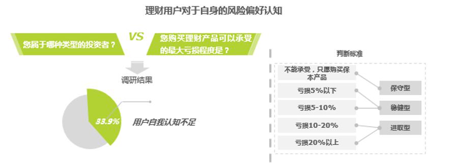33.9%的用戶主觀風險偏好與客觀承受能力并不匹配,比如,“可承受10-20%虧損”的人在投資判斷標準中已經算是進取型,但他卻主觀認為自己是“保守型”用戶。