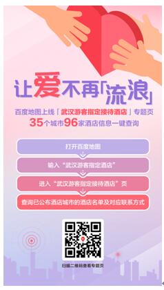 百度地圖根據武漢市文化和旅游局官方發布信息,于1月29日特別緊急上線了“武漢游客指定接待酒店” 專題頁面,聚合來自各地的集中接待信息,方便在外的武漢及湖北游客更快找到所在城市的指定接待酒店。截至目前,百度地圖已上線了35個城市96家指定接待酒店,并將持續跟進最新信息,充分發揮平臺信息整合優勢,保障人民的生命健康安全。