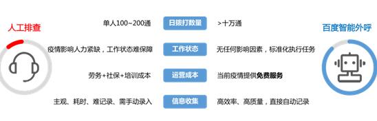 針對疫情防控工作中基層社區居民排查、快速摸清健康情況和流動情況的需求,百度推出針對疫情防控的智能外呼平臺,可提供流動人員排查、本地居民排查/回訪、特定人群通知三大場景的外呼服務,能被應用于社區情況排查和通知回訪等場景,比人工電話效率提高數百倍。