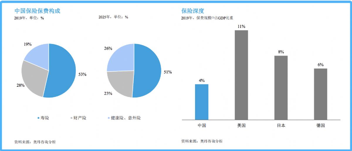 奧緯咨詢分析的數據顯示,2019年中國保險保費規模達4.3萬億元,預計到2021年將達到5萬億元,2025年將攀升至8.6萬億元;其中,2019年中國在線保費規模達到0.3萬億元,在數字化技術的驅動下,預計在2025年可達到1.9 萬億元的規模,相較于超8億萬的市場占比仍然較小。