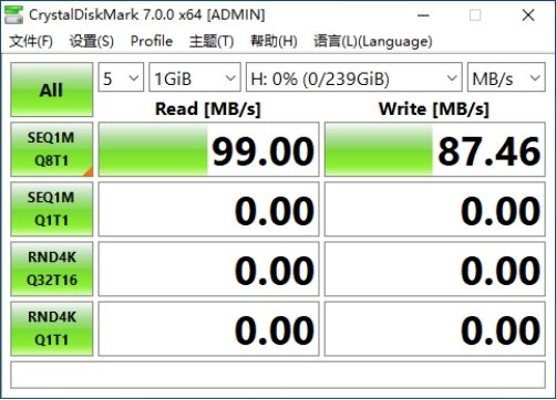 首先是CrystalDiskMark測試,根據結果可以看到,三星PRO Plus性能表現十分優異,其讀取速度能夠達到99MB/s,與官方宣稱的100MB/s基本一致。持續寫入速度能夠達到87.46MB/s,與標定的90MB/s相差無幾綜合來看,256GB規格的PRO Plus讀寫性能不錯,在同類型SD卡中屬于優秀的水平,官方果然誠不欺我。