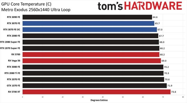 在溫度方面,RTX 3070公版在《地鐵:離去》2K最高畫質的循環測試中維持在65.7度,而RTX 2080Ti公版的溫度為70.3度。