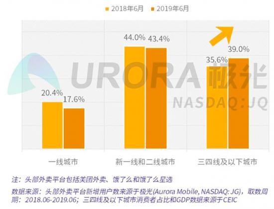 據極光調研數據顯示,截至2019年6月,頭部外賣平臺新增用戶數在三四線及以下城市的占比擴大至39%,外賣平臺安裝滲透率為12.9%,相較去年同期增長5.78%。與此同時,一二城市的外賣增速正在下滑。