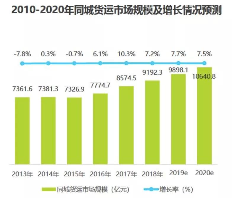 根據艾瑞咨詢的研究報告,過去三年,由于中國整個物流行業的穩定增長,同城貨運也保持著每年7%以上的速度擴大,并且將在2020年突破萬億。