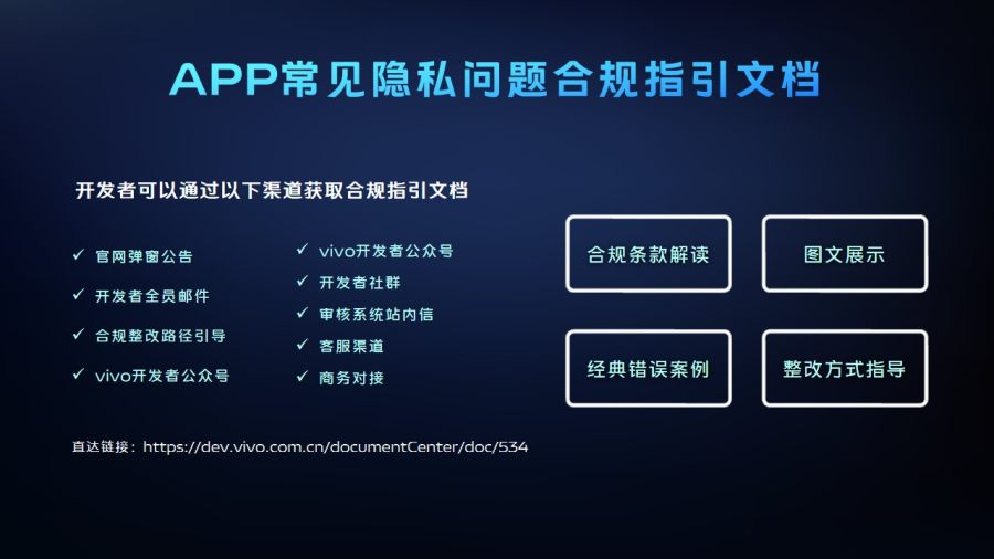 2021年起,為加強用戶個人隱私安全和信息保護,vivo應用商店聯動開發者共建和諧健康的網絡生態環境,通過合規解讀、審核標準升版、自動化檢測能力升級、APP巡檢排查、合規宣導、協助開發者整改、APP違規處罰、用戶反饋等舉措進行APP全鏈路管理。