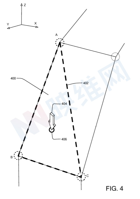 圖4示出了虛擬用戶空間(由X-Y-Z軸表示)中的特征曲面400的示例定義。在特征點選擇器選擇了至少三個特征點A、B和C的情況下,特征曲面管理器使用三個特征點A、B和C為三角形網格定義三角形402。光線投射軸與箭頭注釋404共線。