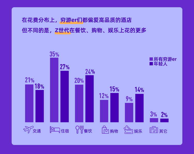而在旅游花費方面,窮游er愿意將更多預算用于住宿,占比達到35%。他們秉承睡得好才能玩得好的精神,偏愛高品質酒店。與其他人群不同的是,Z世代同樣注重吃喝玩等方面的高品質,在餐飲、購物、娛樂方面的花銷更高。