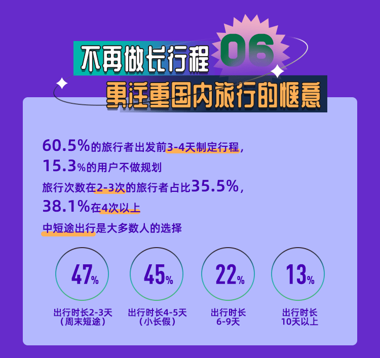 不難看出,人們仍舊保持著旅行的熱情。疫情常態化下,旅行新變化儼然發生。周邊游、戶外游、特色酒店等已成為更多人的新選擇,城市內深度游的挖掘,對中華文化的自豪感變得更強。旅行者們也更愿意走向戶外,親近自然,以實際行動踐行負責任的旅行。隨著未來入境游、出境游的逐步推動,中國旅行業將以更高的品質和服務、更多元的產品體驗滿足國內外旅行者。同時,中國的旅行者們也將以嶄新的面貌繼續探索世界,讓旅途永無窮盡。