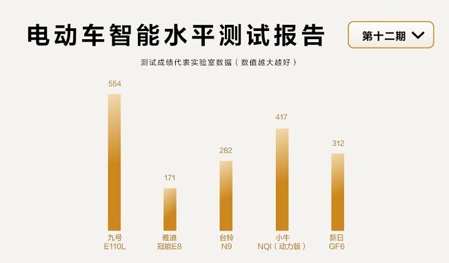 第十二期參與測評的電動車是九號E110L、小牛NQi(動力版)、新日GF6、臺鈴N9以及雅迪冠能E8五種車型。