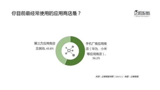 而到了2017年,根據企鵝智庫的數據調查顯示,在用戶最常使用的應用商店中國,手機廠商應用商店(小米、華為等應用商店)已經占比達到56.2%。超過了第三方應用商店。
