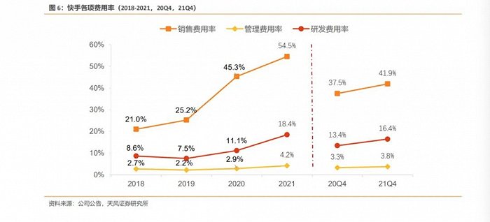 從圖中可以看出,快手的「三費」中,除了2019年管理和研發費用率略有下降,2020、2021都呈持續上漲趨勢。尤其是銷售費用率,過去四年一直為上升狀態。2021年全年,快手的三項費用率為54.5%、18.4%、4.2%,加起來為77.1%。