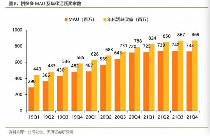事實也證明,2019年一季度,拼多多的月活為2.9億,年度活躍買家則是4.43億。現在這兩個數字分別為7.33億和8.68億。彼時的用戶規模只有當下的一半。