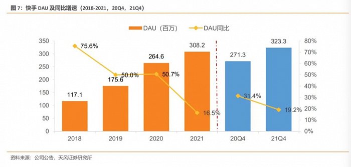 2020年全年,快手的這項支出就激增到266億元,對應到新增DAU為1.51億。折合一個DAU,新獲取成本為176元。這一年也是快手完成3億DAU的時刻。