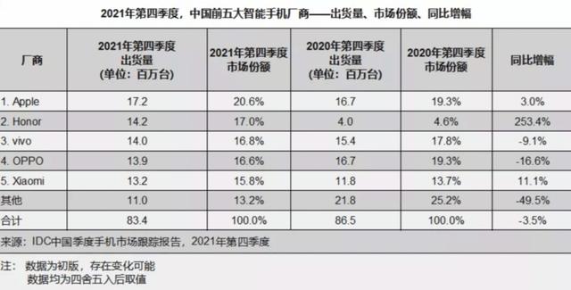 根據IDC的數據,2021年全年,榮耀市場占比11.7%。比2020年的11.3%略有增長。但是,綜合整個2021年的表現,榮耀還未恢復到原來的水平。