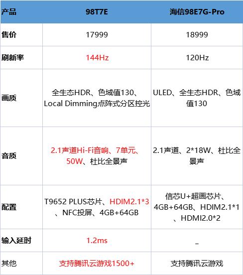 為何TCL這款高刷新品一上市就受用戶的熱情追捧,我們不妨拿同是高刷產品的海信98E7G-Pro和TCL 98T7E對比一下,就知道原因何在了。