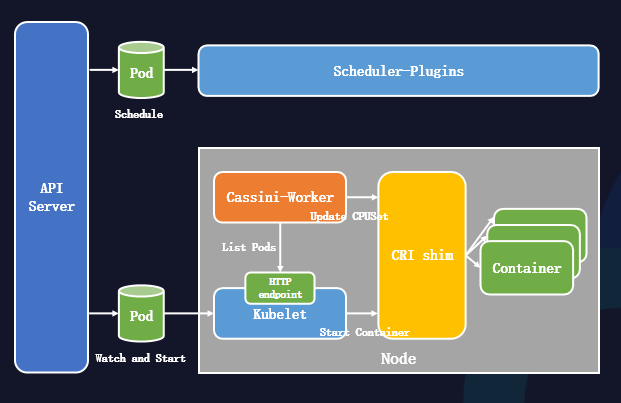 節點Cassini-Worker調用容器運行時接口來更改容器的綁核結果。