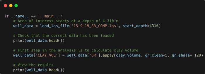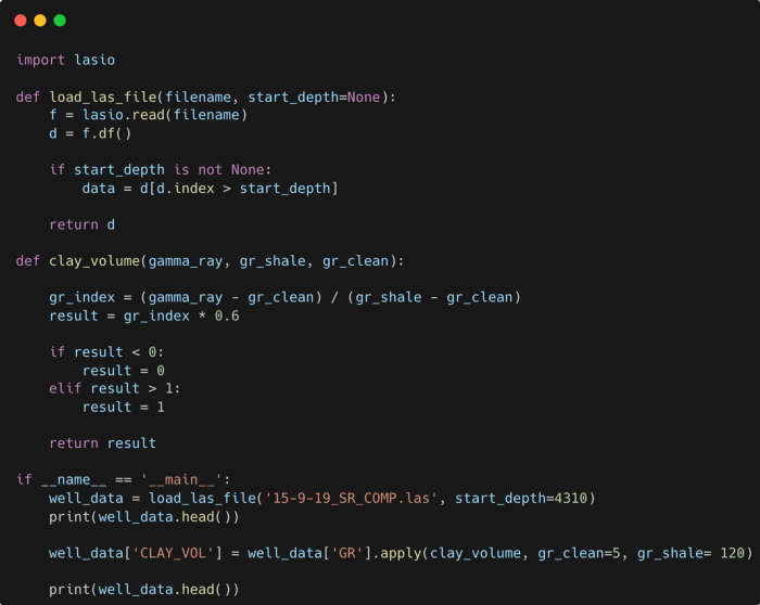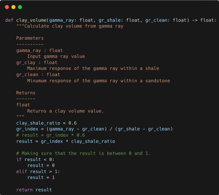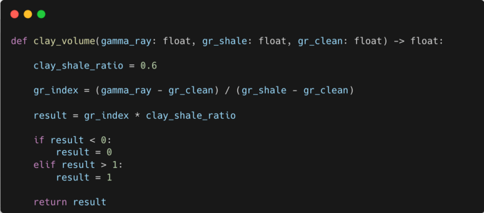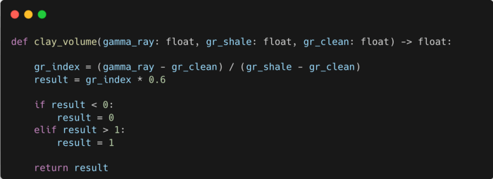 如果我們聲明一個變量并將該值賦給它,那么我們就更有可能知道它是什么。在這種情況下,將伽馬射線指數轉換為粘土體積所用的是粘土與頁巖的比值。
