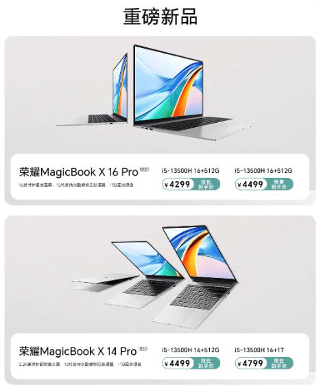 其中,榮耀 MagicBookX 14Pro 采用高品質鋁合金材料,15.9mm 厚度,1.34kg 的重量,實現極致輕薄美學設計機身。14 英寸護眼全面屏,超窄邊框設計,低藍光、無頻閃,既專業又安全。搭載英特爾 13 代酷睿 i5-13500H 標壓處理器,擁有 12 核 16 線程,性能超群。新機預售已開啟,16+512G 版本,京東首銷直降 200 元,優惠到手 4499 元;16+1T 版本,首銷直降 200 元,優惠到手價 4799 元,還有機會贏榮耀路由器。