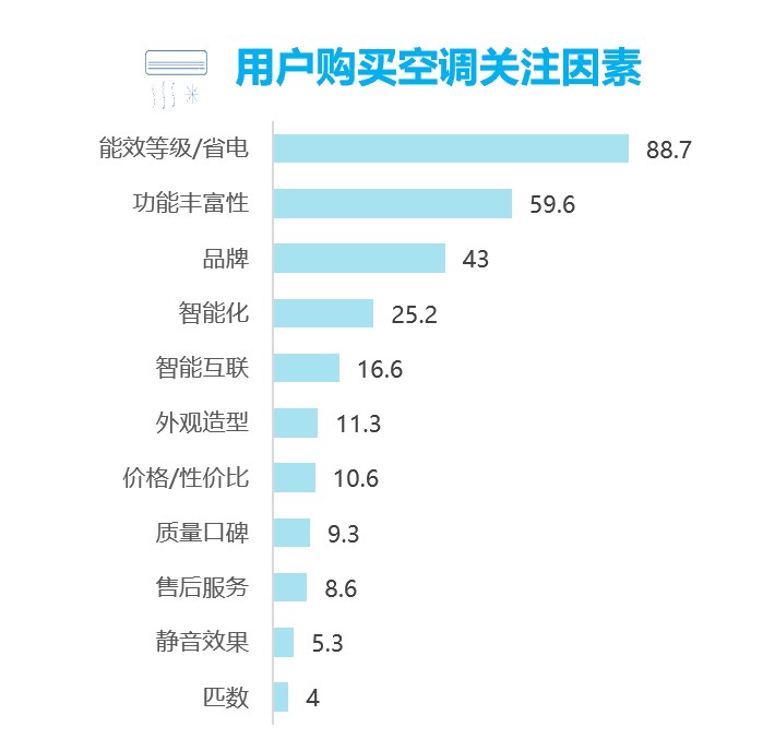 聚焦空調這一代表性的白電產品,卓思的體驗需求洞察結果顯示,用戶在購買過程中最關注的是“能效等級/省電”,占比高達88.7%。除去“環保”因素,絕大部分用戶非常關注產品的后續使用成本。
