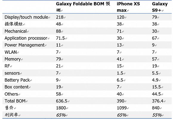 以三星的可折疊屏手機為例,其元器件成本要比iPhone XS高出約65%,其成本增加項主要為屏幕模組和鉸鏈元器件。