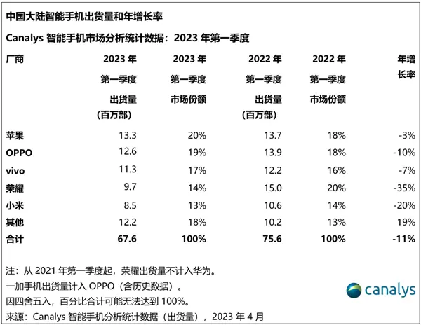 OPPO(含一加)、vivo列二三位,榮耀、小米則排在四五位。
