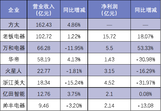 傳統廚電企業方太和老板電器的營收在百億級別,去年分別拿下為162.43億和102.72億;華帝和萬和處于第二梯隊,去年營收分別為66.28億和58.19億。