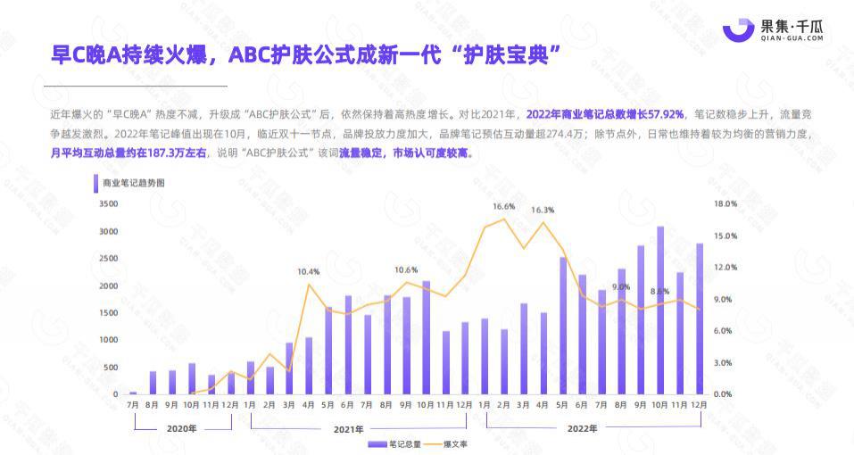 「早 C 晚 A」還有一個后續發展是,被美護品牌們升級為「ABC 護膚公式」。在千瓜發布的 2022 年度商業關鍵詞調研報告中可以看到,2022 年小紅書「ABC 護膚公式」相關商業筆記對比 2021 年總數增長 57.92%。多個品牌的投放力度加大,證明這一趨勢的穩定。