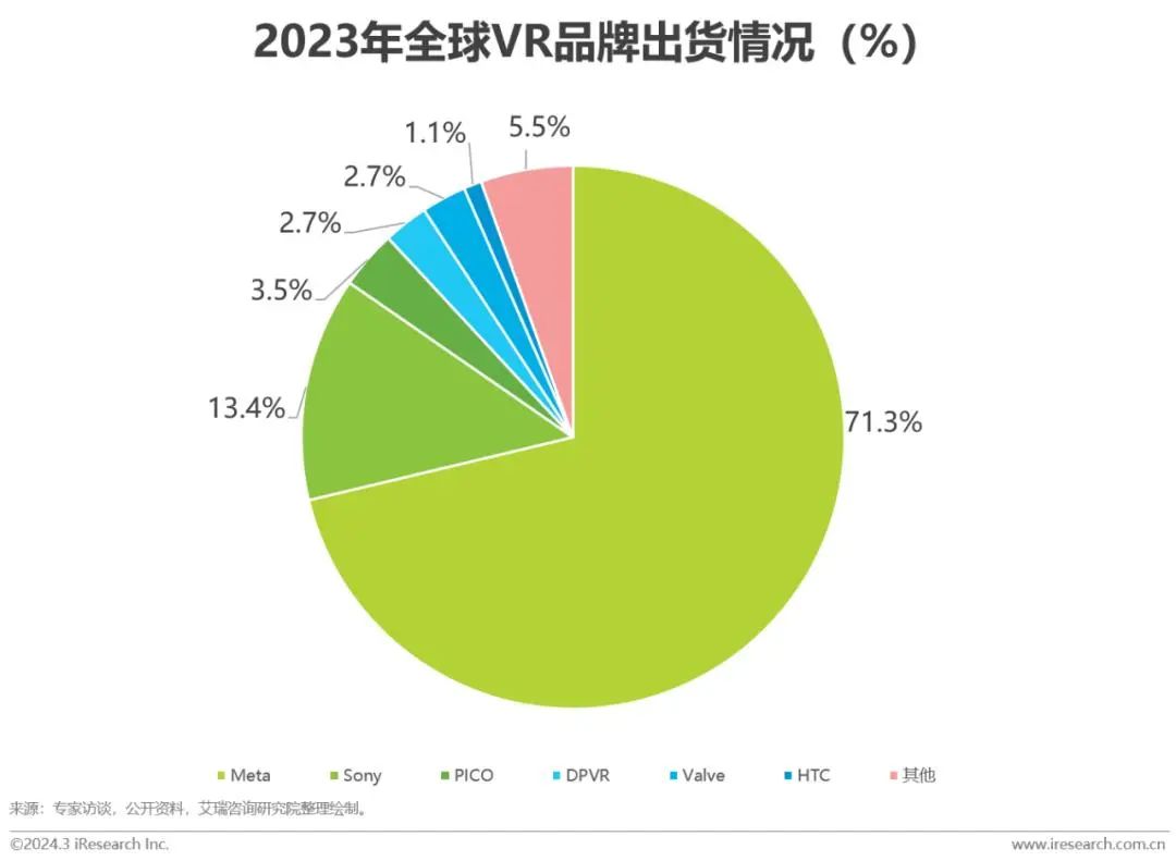 根據艾瑞咨詢發布的報告顯示,2023年全球整體VR出貨為765萬臺,Meta領跑市場,占比為71.3%,而HTC的VR份額為1.1%,排在第六位,與之相差巨大。