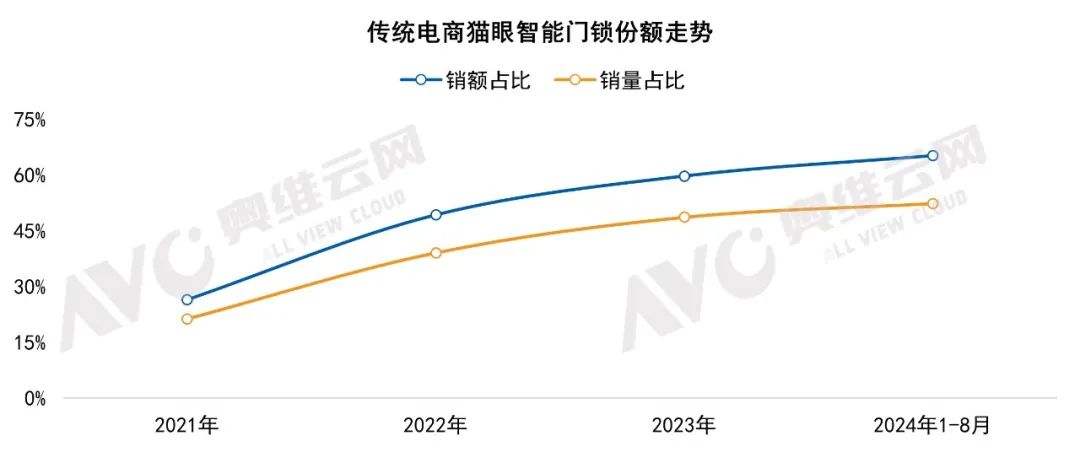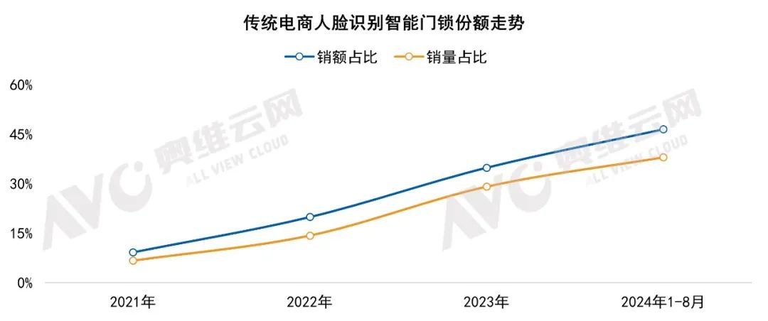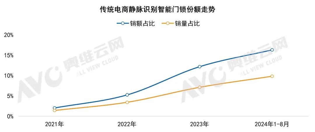 2023年至2024年,靜脈識別智能門鎖的市場接受度和普及率持續增長。奧維云網(AVC)線上監測數據顯示,2024年1-8月傳統電商靜脈識別智能門鎖零售額占比達到16%,零售量占比達到10%。