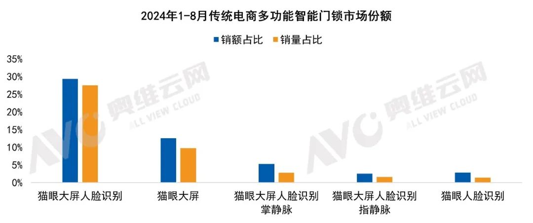 目前市場上,最受消費者歡迎的多功能智能門鎖組合是“貓眼+大屏+人臉識別”。奧維云網(AVC)線上監測數據顯示,2024年1-8月該組合在傳統電商的零售額及零售量占比分別為29%和28%,較去年同期分別增長了11個百分點和8個百分點。此外,“貓眼+大屏”、“貓眼+大屏+人臉識別+掌靜脈”、“貓眼+大屏+人臉識別+指靜脈”以及“貓眼+人臉識別”的組合則分別占據市場第二至第五的位置。