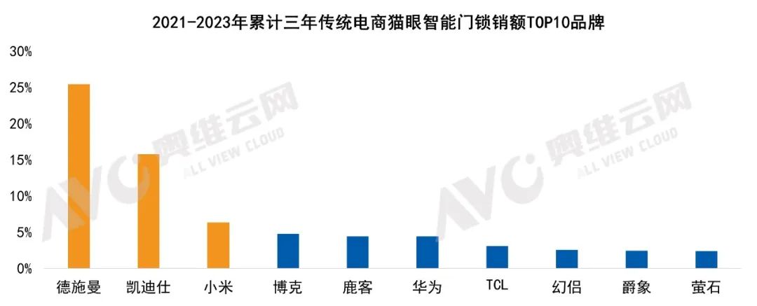 德施曼在人臉識別智能門鎖市場上占據領先地位。奧維云網(AVC)線上監測數據顯示,在2021年至2023年期間,德施曼在傳統電商渠道人臉識別智能門鎖市場中占據了19%的零售額份額,位居榜首。