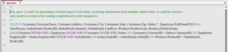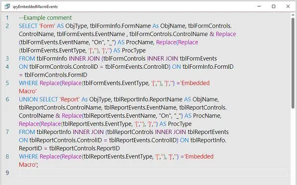在 Access 查詢中,注釋僅支持在文本開頭,而在遠程 SQL 查詢中可以在任意位置添加,注釋以綠色顯示。