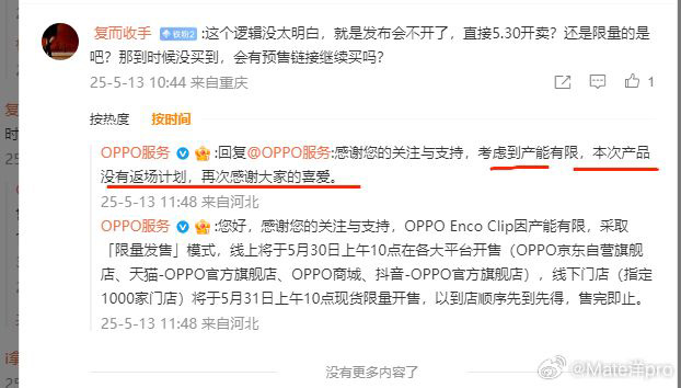 5月13日OPPO在社交平臺宣布,“OPPO Enco Clip因產能有限,不得不限量發售”。然而有博主的截圖顯示,“OPPO服務”的認證賬號在回應網友評論時表示,“本次產品沒有返場計劃”。OPPO作為大廠,也是耳機知名品牌,產品還未發布就說產能不足,還要沒有返場計劃,事出反常必有妖。