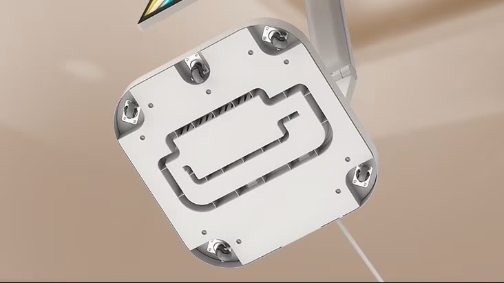 加厚方形底座穩固可靠,簡約灰白色外觀能無縫融入家庭與辦公環境,兼顧實用與美學。底部的高強度滾輪,可實現自由移動,滑行順暢又穩定。隱藏式電源適配器設計,有效收納線纜,保持桌面整潔有序,營造出清爽的工作和生活空間。